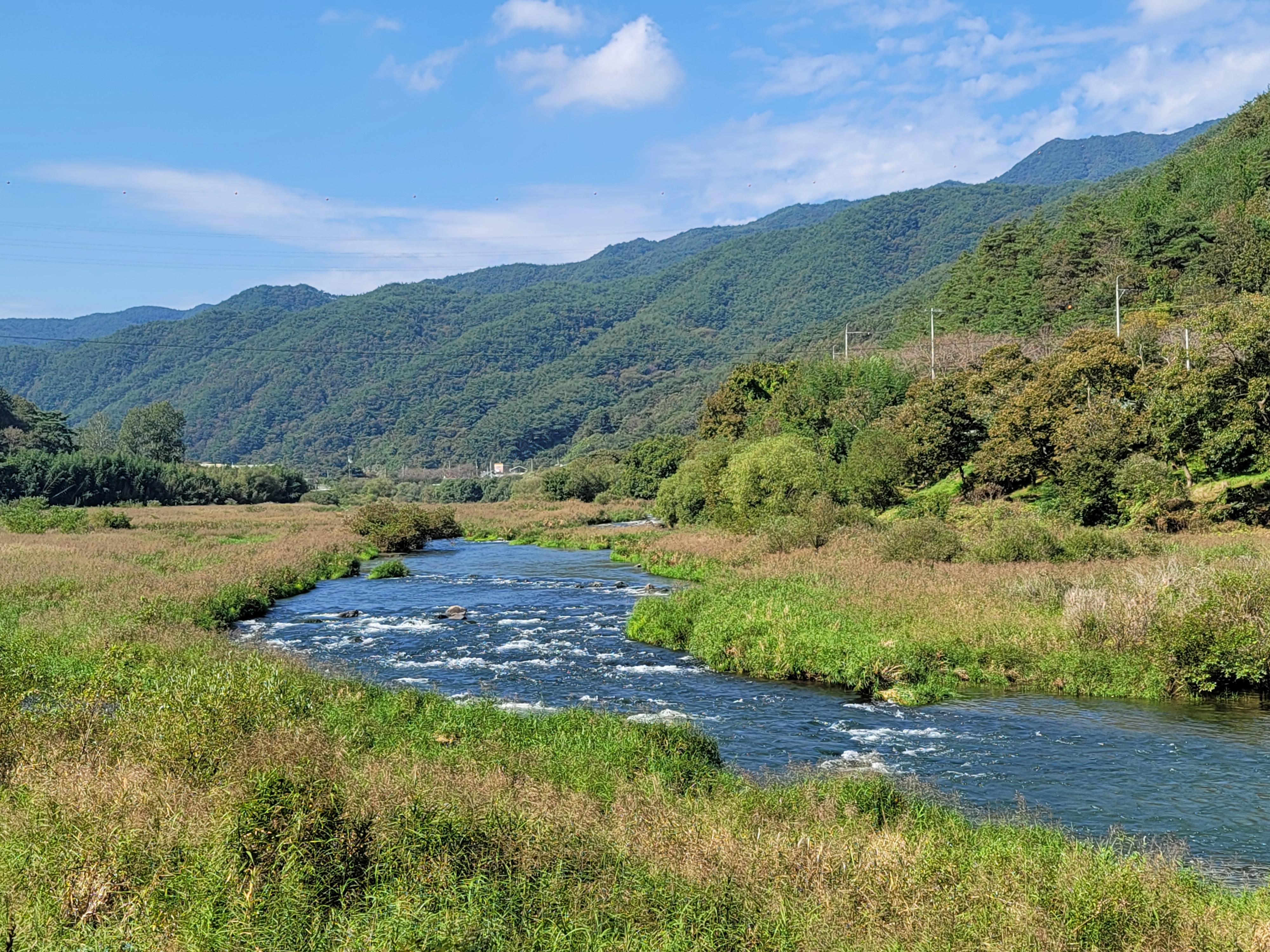 아름다운 대황강, 보성강 지전거길 안내판, 예로부터 보성강을 크고 거칠다는 의미의 대황강이라고 불렀다네요.