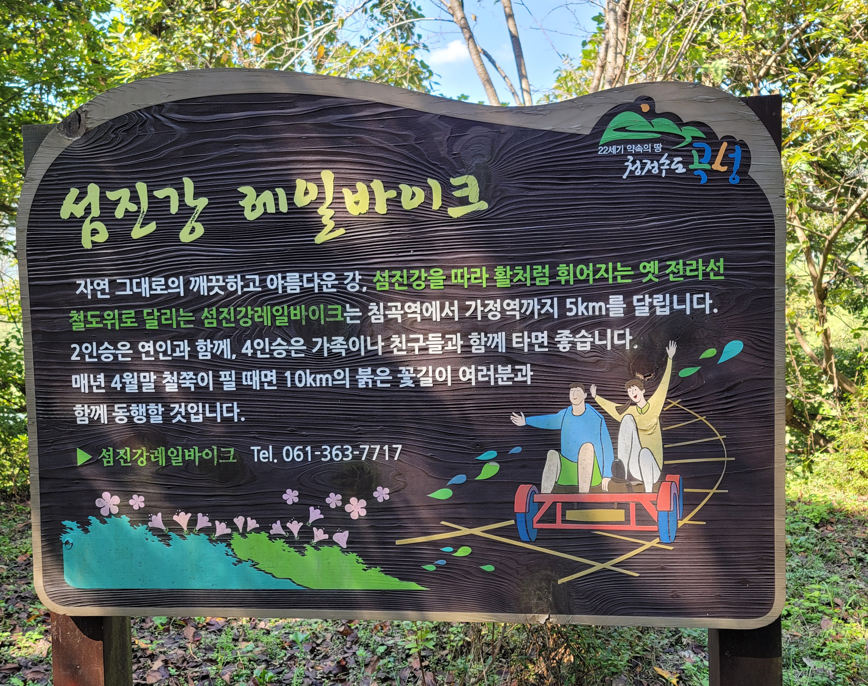 곡성 관광- 섬진강기차마을과 옛 전라선 철도위로 달리는 섬진강레일바이크 안내판